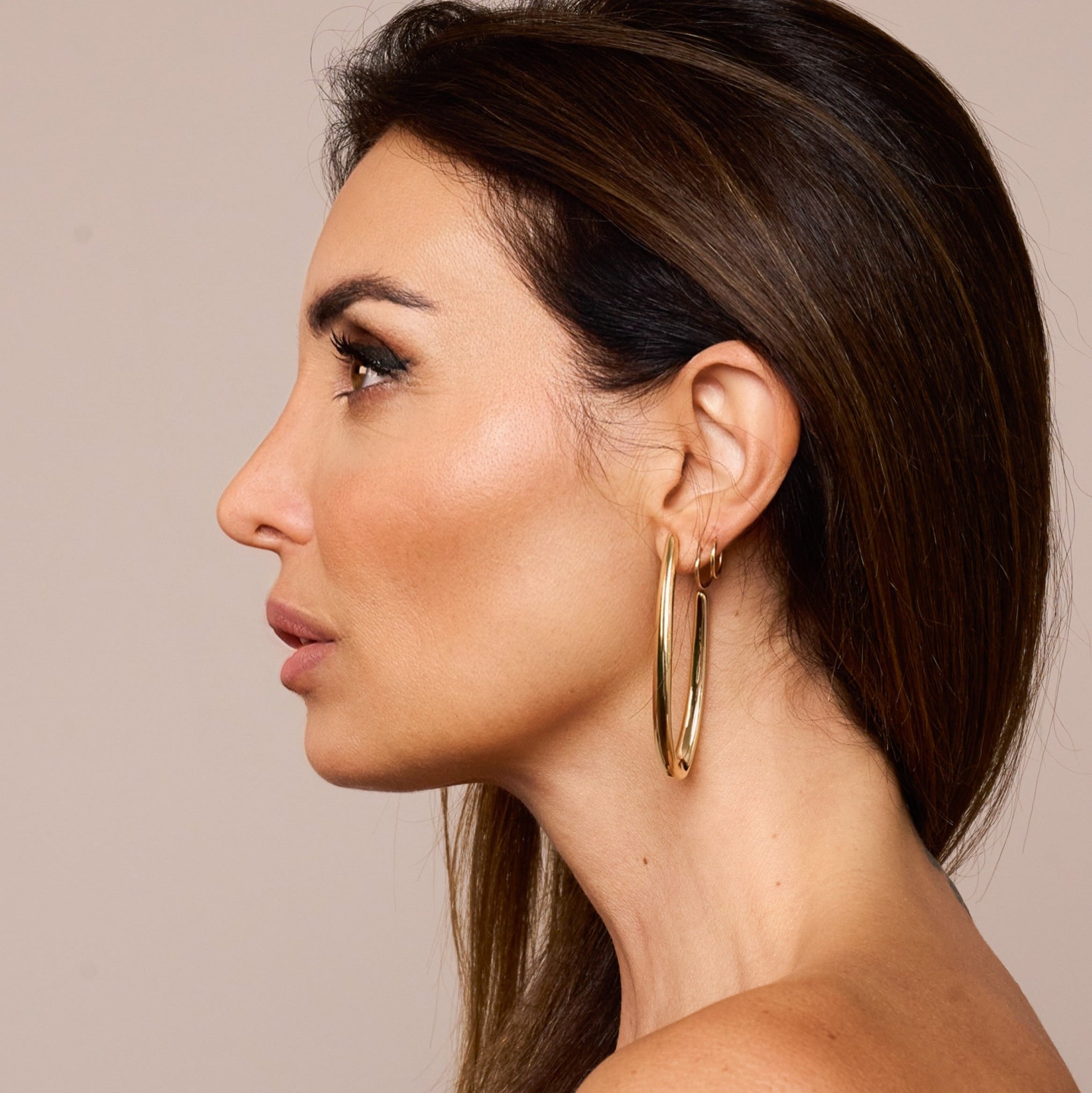 The Alessandra hoop earrings in yellow or white gold-plated silver combine elegance and modernity, enhancing every look with a touch of sophistication. Their elongated shape elongates the face, creating a subtle and refined effect. Each pair weighs 8.5g. Crafted using the electroforming technique, they are nickel-free, hypoallergenic, and created with high-quality materials, offering you a safe and refined piece of jewelry.